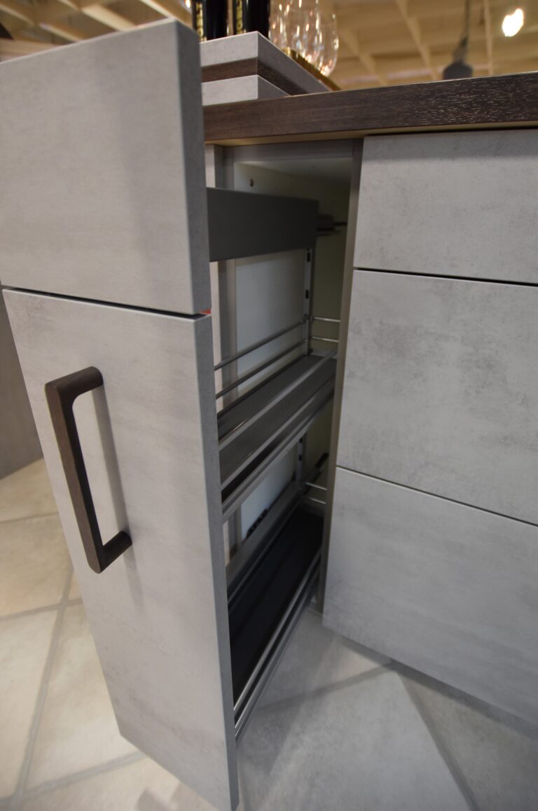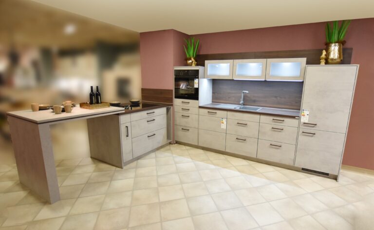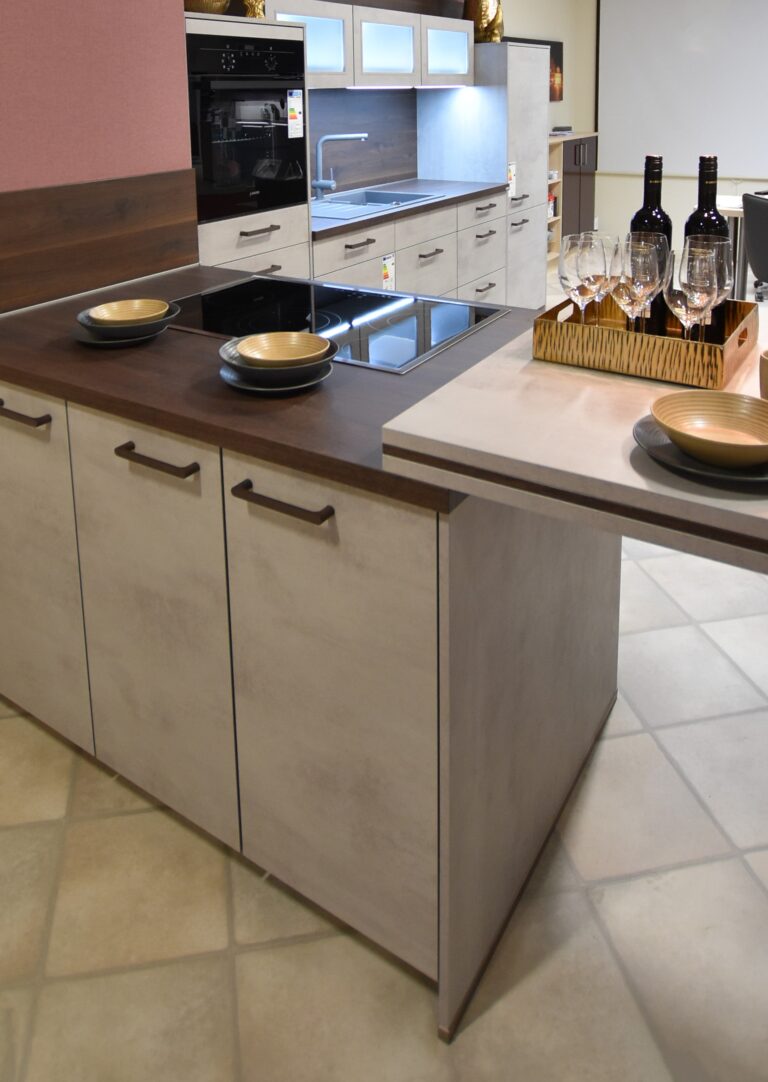 Entdecken Sie unsere Küche Riva im angesagten Beton Grau NB – aktuell im Abverkauf im Wohn- und Küchencenter Greifswald! Die markante Arbeitsplatte in Walnuss NB bringt dabei einen warmen Kontrast in den modernen Industrie-Stil und sorgt für eine einladende Atmosphäre.