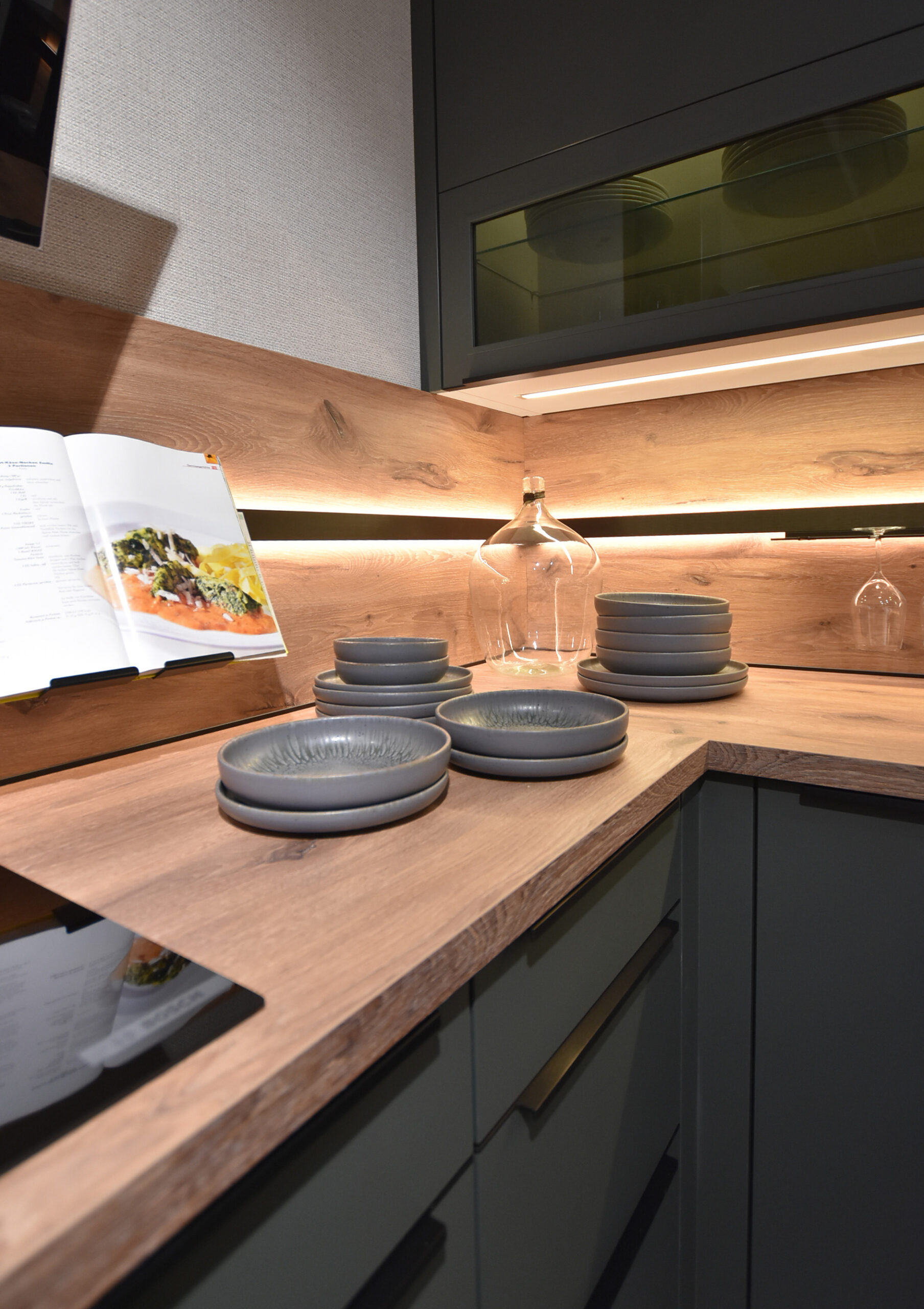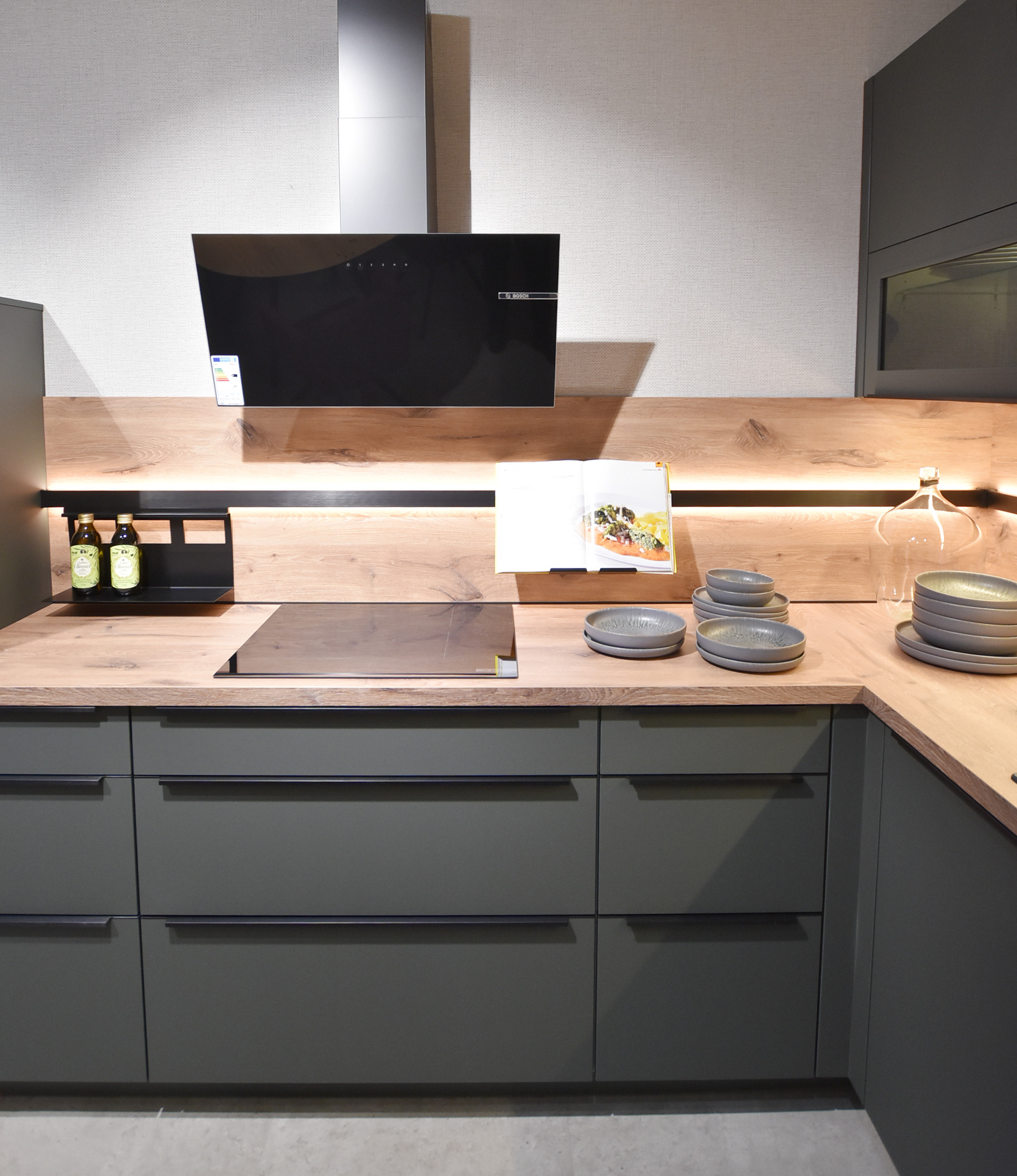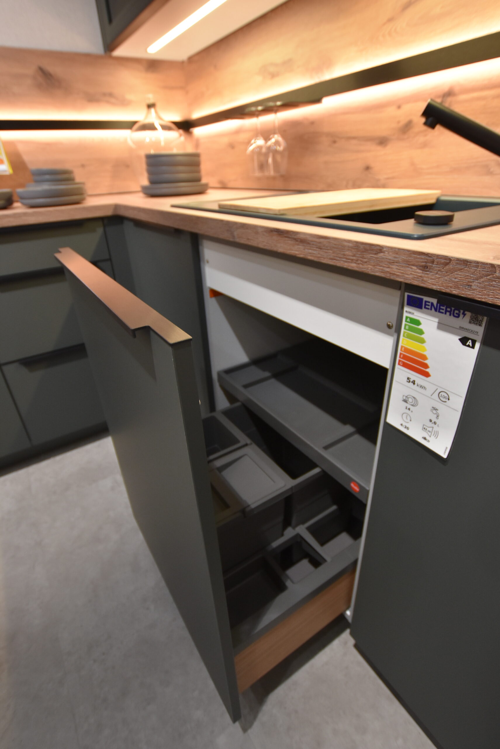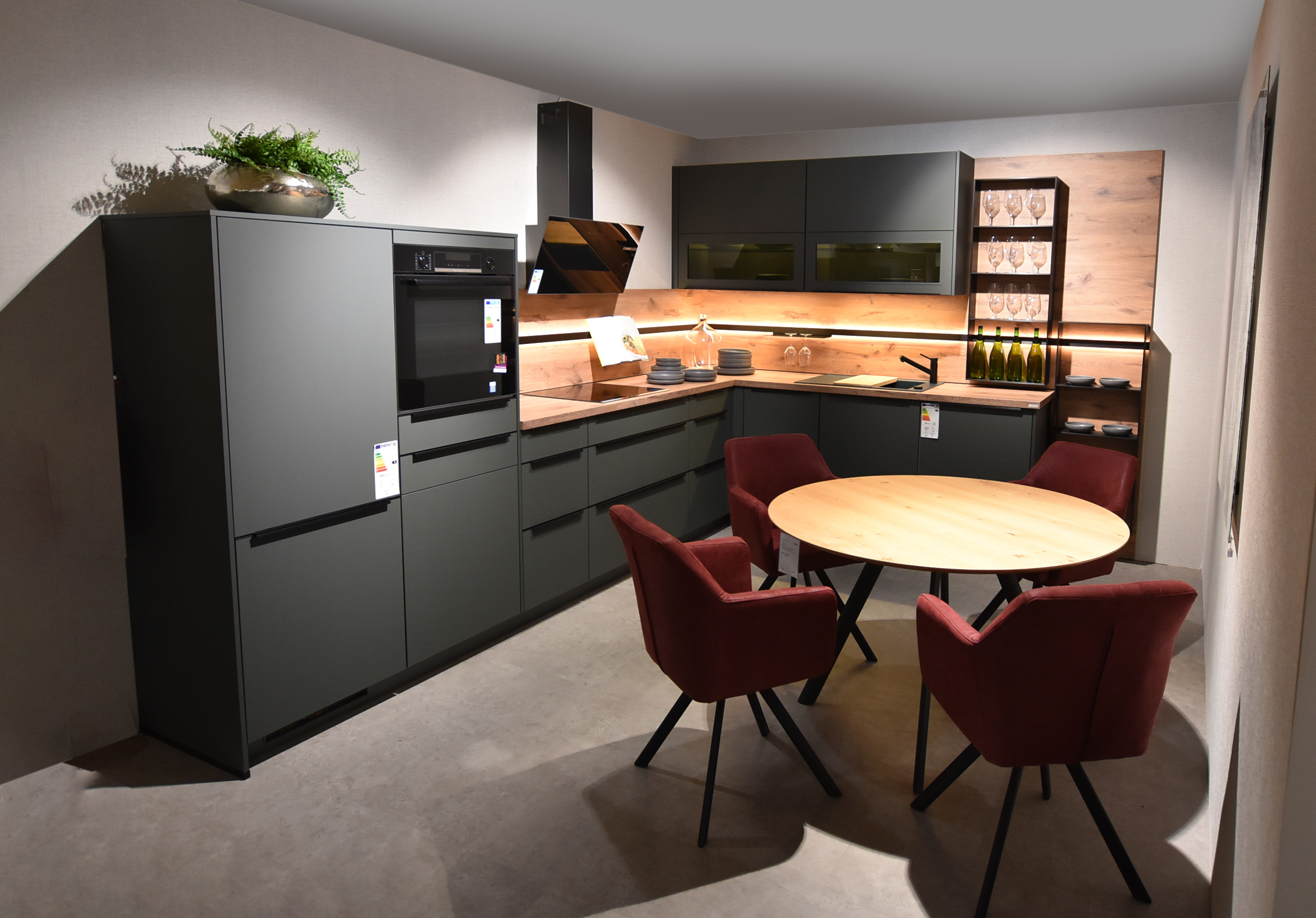 Die Küche „EASYTOUCH“ begeistert mit einer ausdrucksstarken Front in Mineralgrün ultramatt, die trendbewusstes Design mit eleganter Zurückhaltung verbindet. Die samtige Oberfläche sorgt für eine besonders hochwertige Optik und ein ruhiges Gesamtbild. Der Korpus in Steingrau bildet dazu einen stilvollen Kontrast und unterstreicht den modernen Charakter dieser Ausstellungsküche.