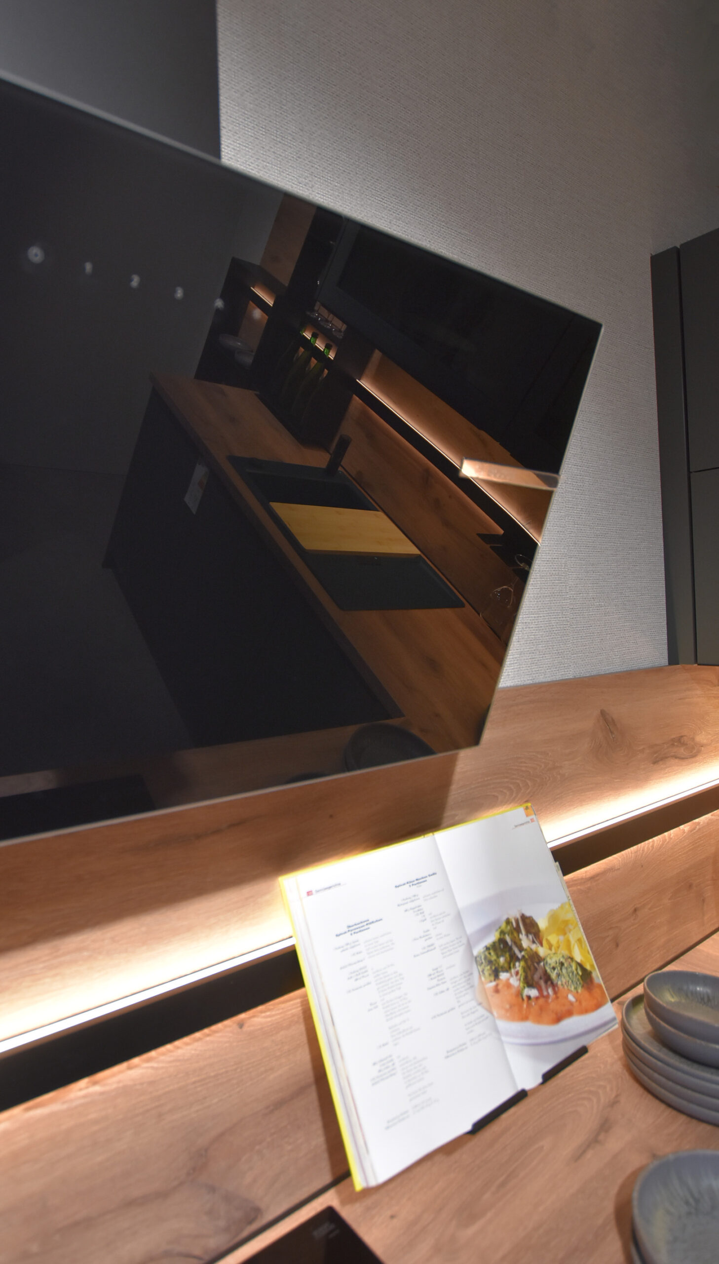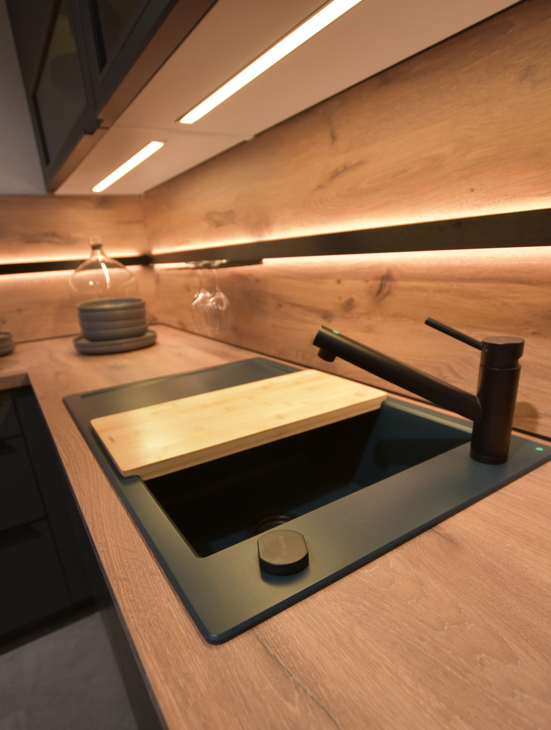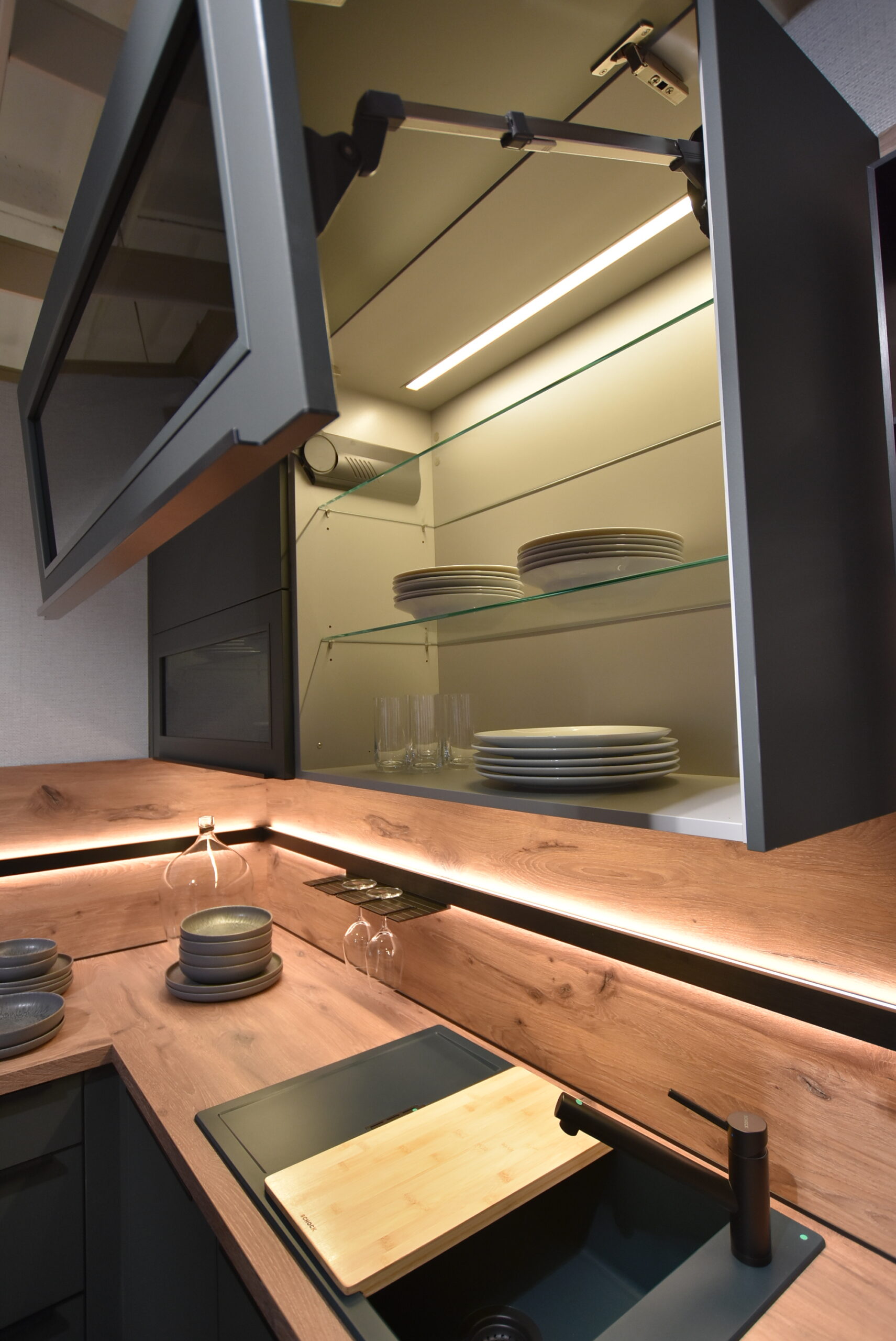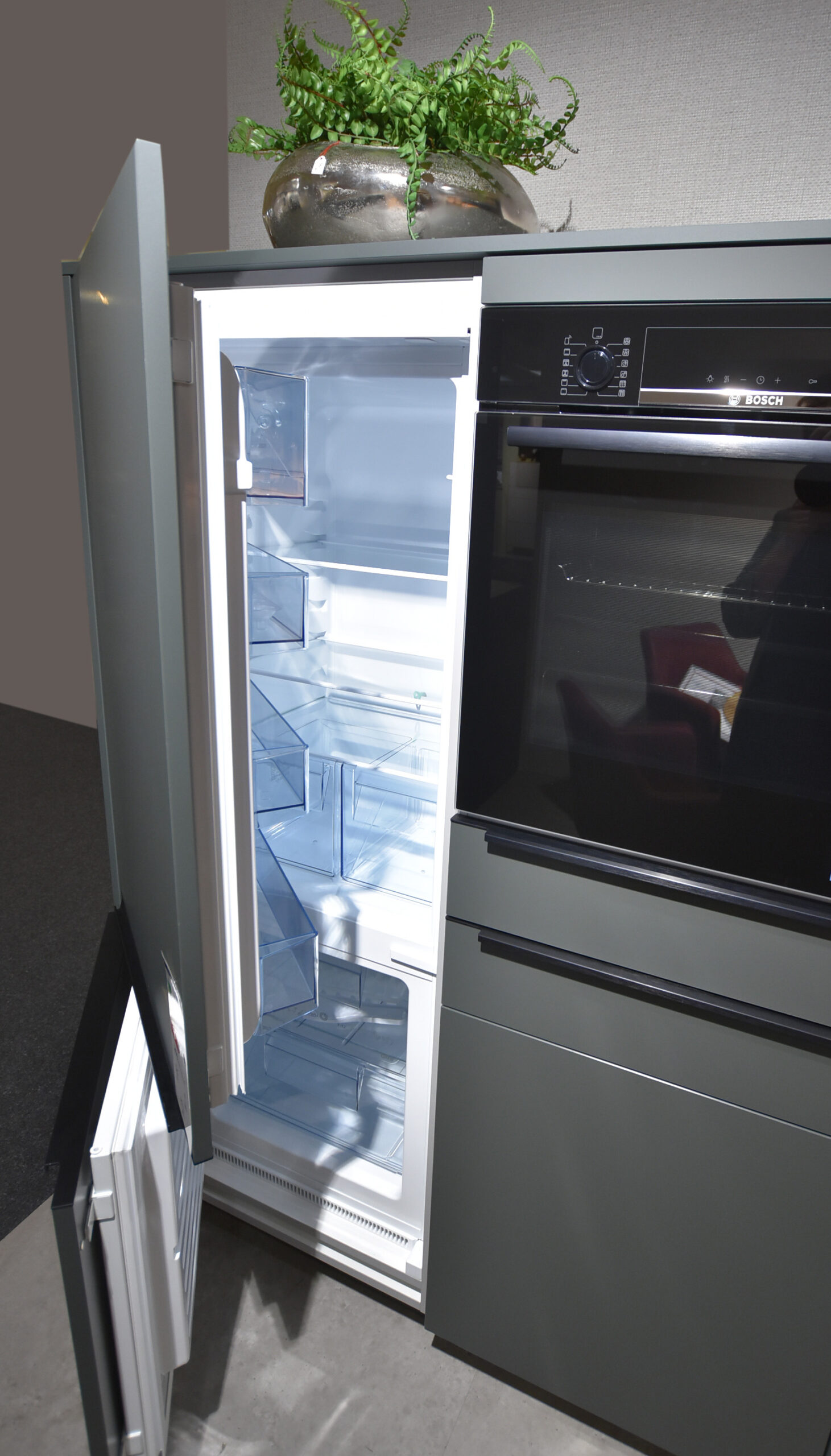 Die Küche „EASYTOUCH“ begeistert mit einer ausdrucksstarken Front in Mineralgrün ultramatt, die trendbewusstes Design mit eleganter Zurückhaltung verbindet. Die samtige Oberfläche sorgt für eine besonders hochwertige Optik und ein ruhiges Gesamtbild. Der Korpus in Steingrau bildet dazu einen stilvollen Kontrast und unterstreicht den modernen Charakter dieser Ausstellungsküche.