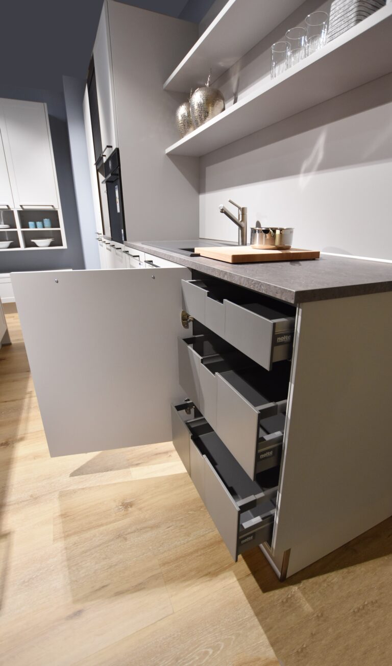 Die Küche Focus überzeugt durch ihre moderne, geradlinige Gestaltung in elegantem Platingrau. Sowohl die Fronten aus hochwertigem Lacklaminat als auch der farblich abgestimmte Korpus verleihen dieser Küche eine stilvolle und ruhige Optik – perfekt für Liebhaber minimalistischen Designs mit hoher Alltagstauglichkeit.