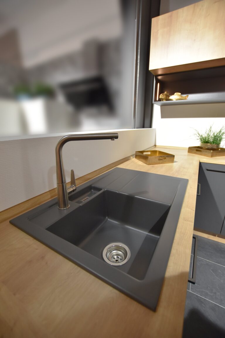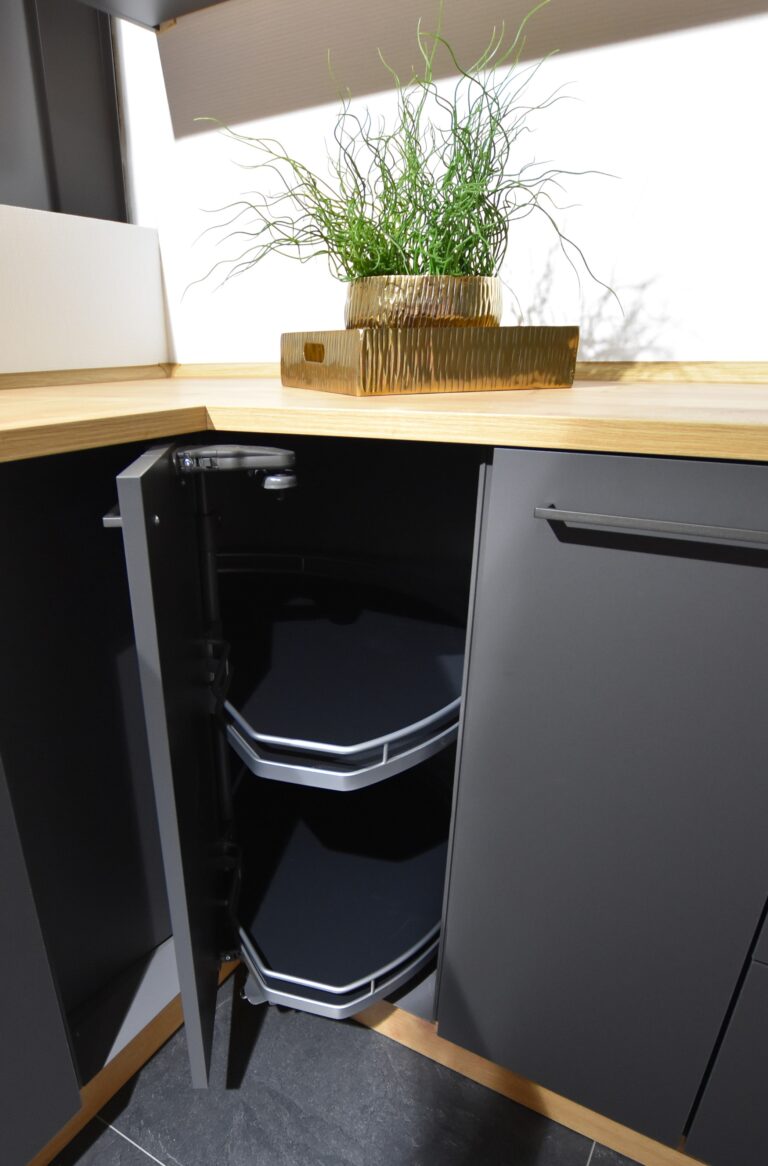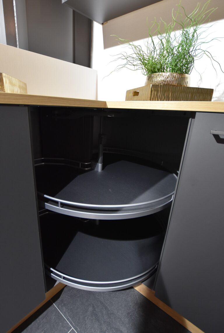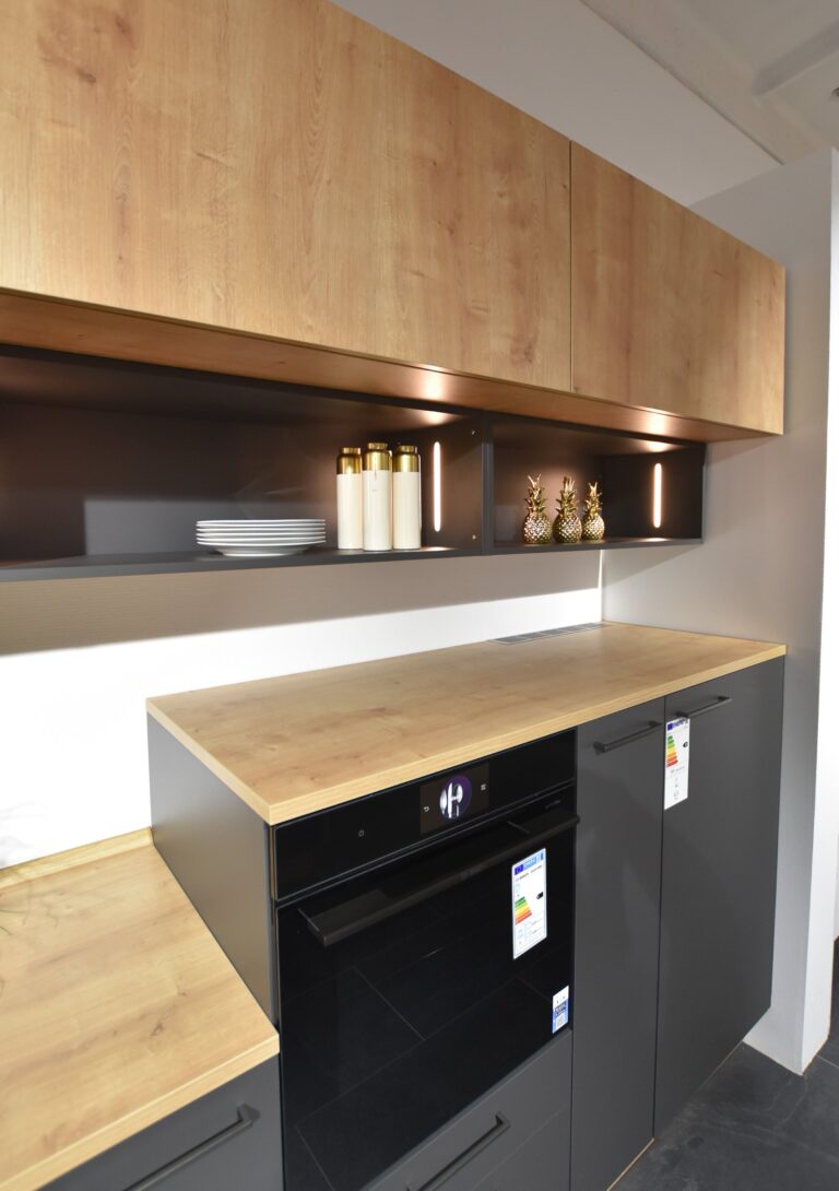 Die Küche Plus begeistert mit einer modernen Kombination aus Fronten in Graphit und Chalet Eiche sowie einem eleganten Korpus in Graphit. Diese hochwertige Küchenlösung verbindet natürlichen Holzcharakter mit zeitgemäßem Industrial-Chic und schafft eine warme, zugleich edle Atmosphäre in Ihrem Zuhause.